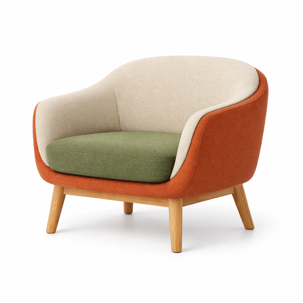 Sillón que combina colores beige, verde y naranja con un diseño funcional.