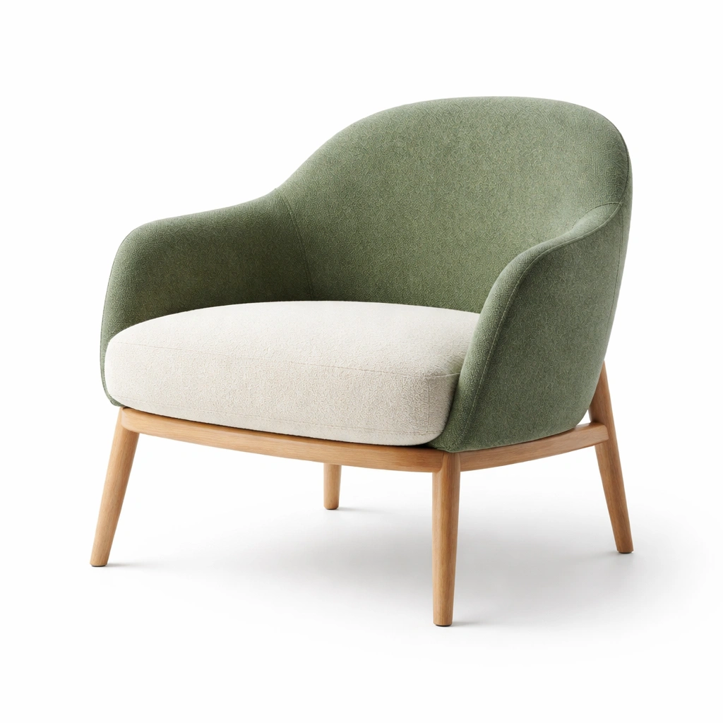 Material: Estructura de madera de roble, asiento y respaldo de tela de poliéster.