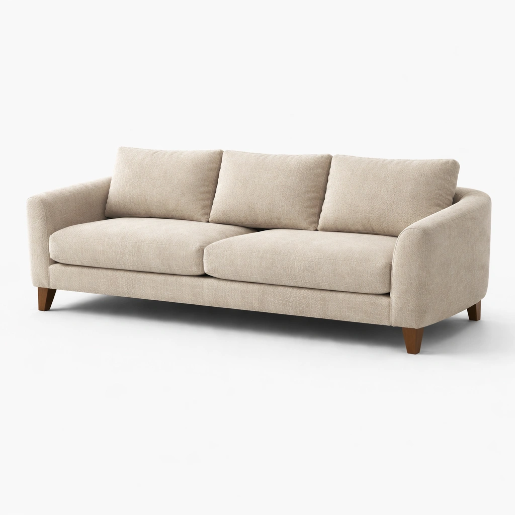 Sofá de tela poliester beige con patas de madera de tres plazas